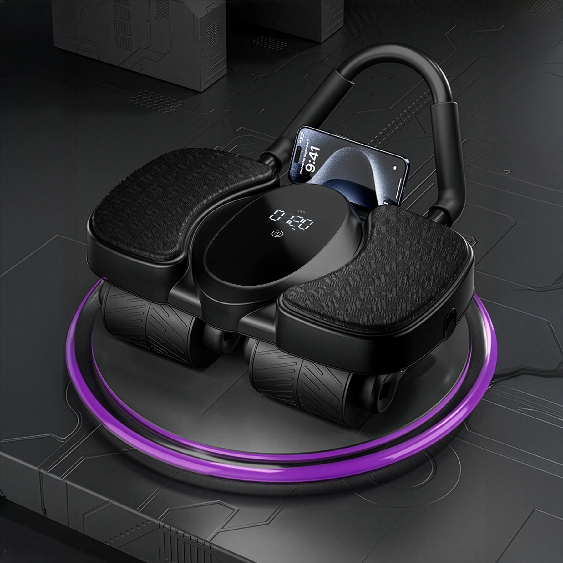 Pro komfortní trénink nechybí široké loketní opěrky a měkká podložka pod kolena. LCD displej přehledně ukazuje čas, kalorie a počet opakování, zatímco držák na telefon umožní sledovat tréninkové plány či videa. Díky rychlé zacvakávací montáži je připraven k použití během chvilky a USB‑C zajistí snadné dobíjení.