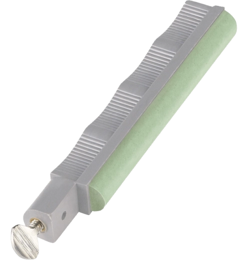 Šedá ergonomická rukojeť poskytuje jistý úchop a bezpečnou manipulaci. Otvor pro vodicí tyčku a integrovaný mosazný závit umožňují použití v systémech LANSKY pro konzistentní úhly a opakovatelné výsledky.