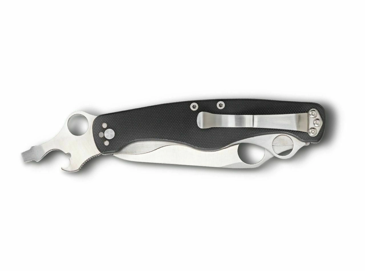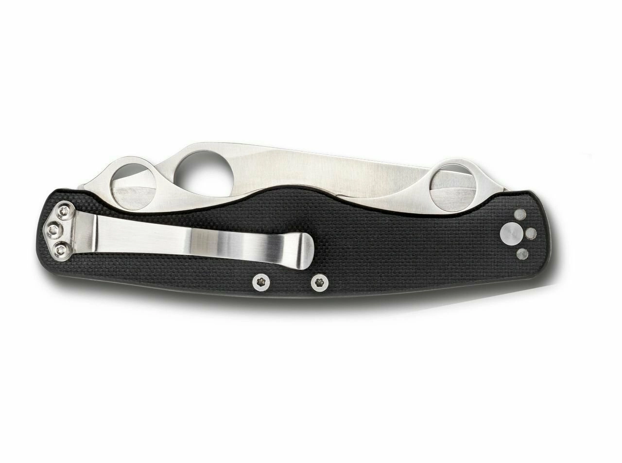 Rukojeť z kompozitu G-10 v černé barvě je vyztužena ocelovými vložkami pro vyšší pevnost. Praktický dvoupolohový kapesní klip usnadňuje každodenní nošení a rychlý přístup.