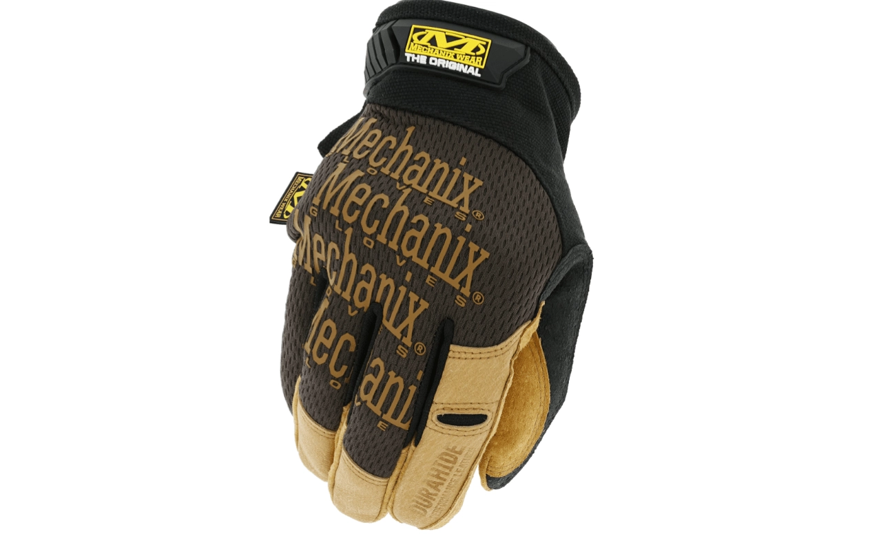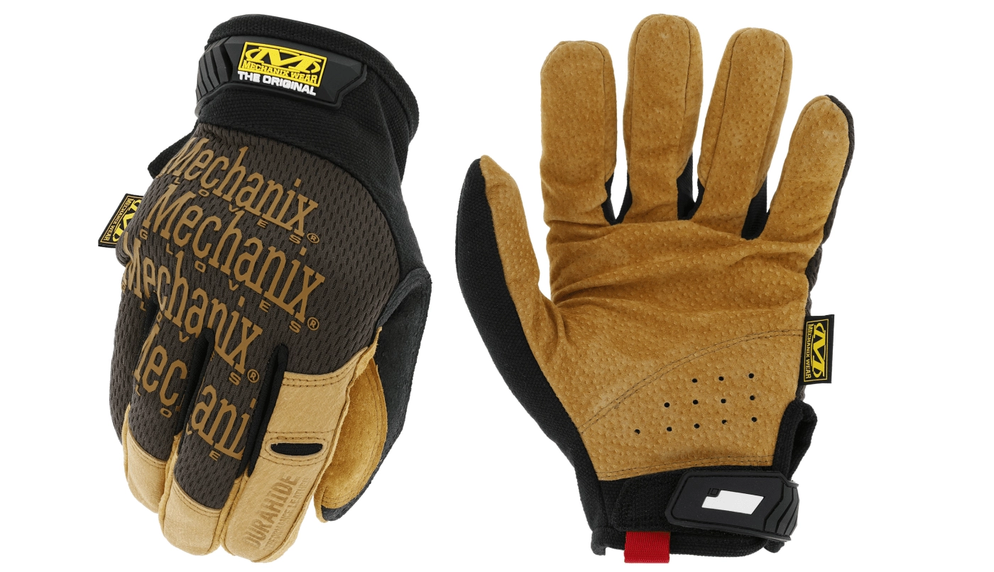 Odolné pracovní rukavice MECHANIX Durahide Original ve velikosti XXL/12 pro manipulaci s materiálem, domácí práce i řemesla. Nabízejí koženou dlaň DuraHide s vysokou odolností proti oděru, prodyšný TrekDry na hřbetu ruky pro pohodlí a spolehlivé zapínání TPR na zápěstí. Lze je prát v pračce.