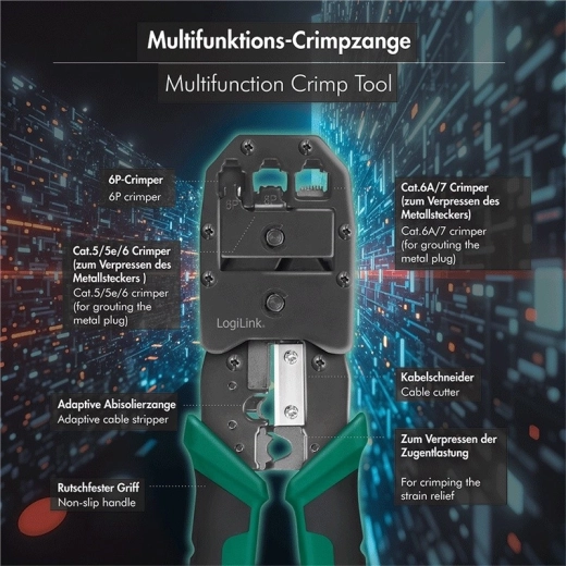 Univerzální krimpovací kleště 6v1 pro modulární konektory RJ11, RJ12 a RJ45 umožňují krimpování, střih i odizolování v jednom kroku. Díky preciznímu zpracování a kompatibilitě s kategoriemi Cat.3, Cat.5e, Cat.6, Cat.7 i s RJ45 s klipem (Cat.6A, Cat.7) zajistí čisté, rychlé a spolehlivé zakončení kabelů.