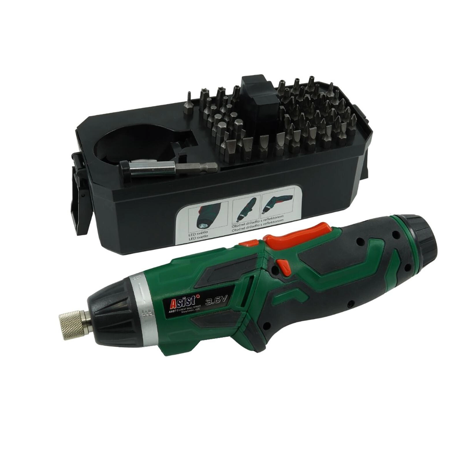 Kompaktní aku šroubovák ASIST s napětím 3,6 V a baterií Li‑ion 1300 mAh je ideální pro domácí montáže a opravy. Nabízí otočné držadlo, LED osvětlení, indikátor nabití a rychlé USB nabíjení za 3–5 hodin. V balení najdete 52dílnou sadu příslušenství včetně 51 bitů a držáku, takže zvládnete šroubování i lehké vrtání do měkkých materiálů.