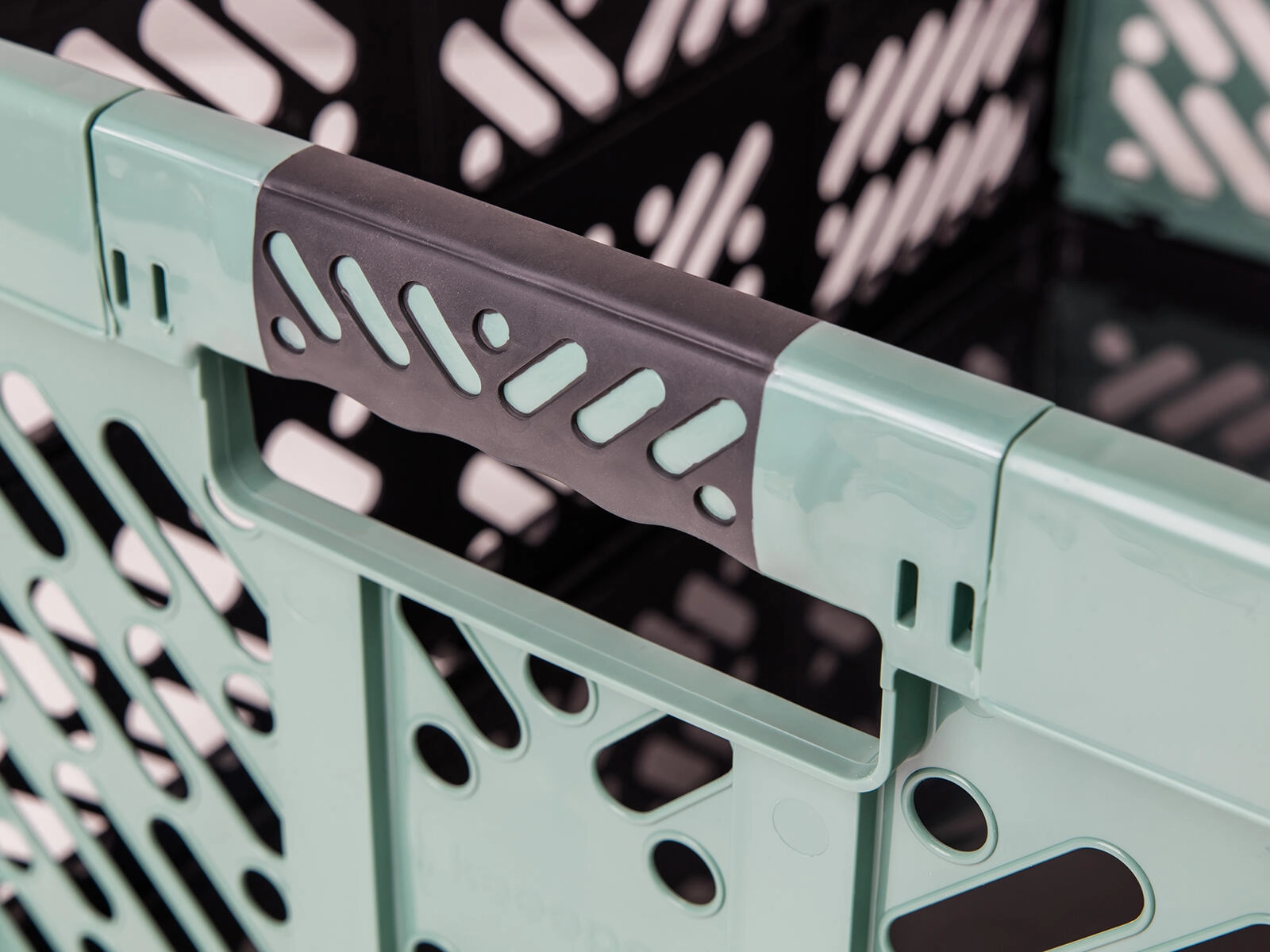 Praktické měkké rukojeti zajišťují pohodlný úchop i při větším zatížení. Větrané bočnice zlepšují přehled a cirkulaci vzduchu, zatímco pevný rám drží tvar a umožňuje stohování. Odolný plast je snadno omyvatelný a vhodný pro opakované každodenní použití.