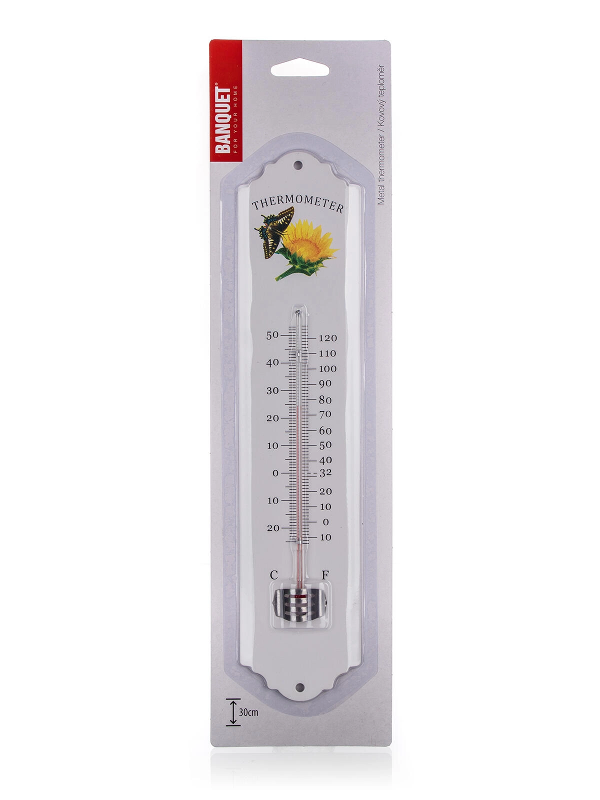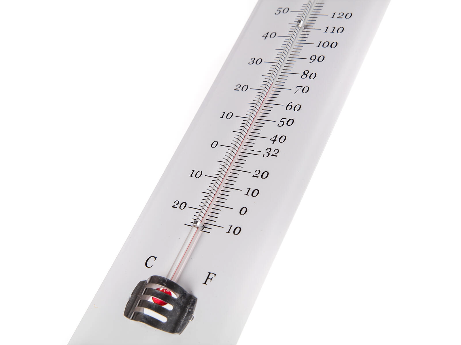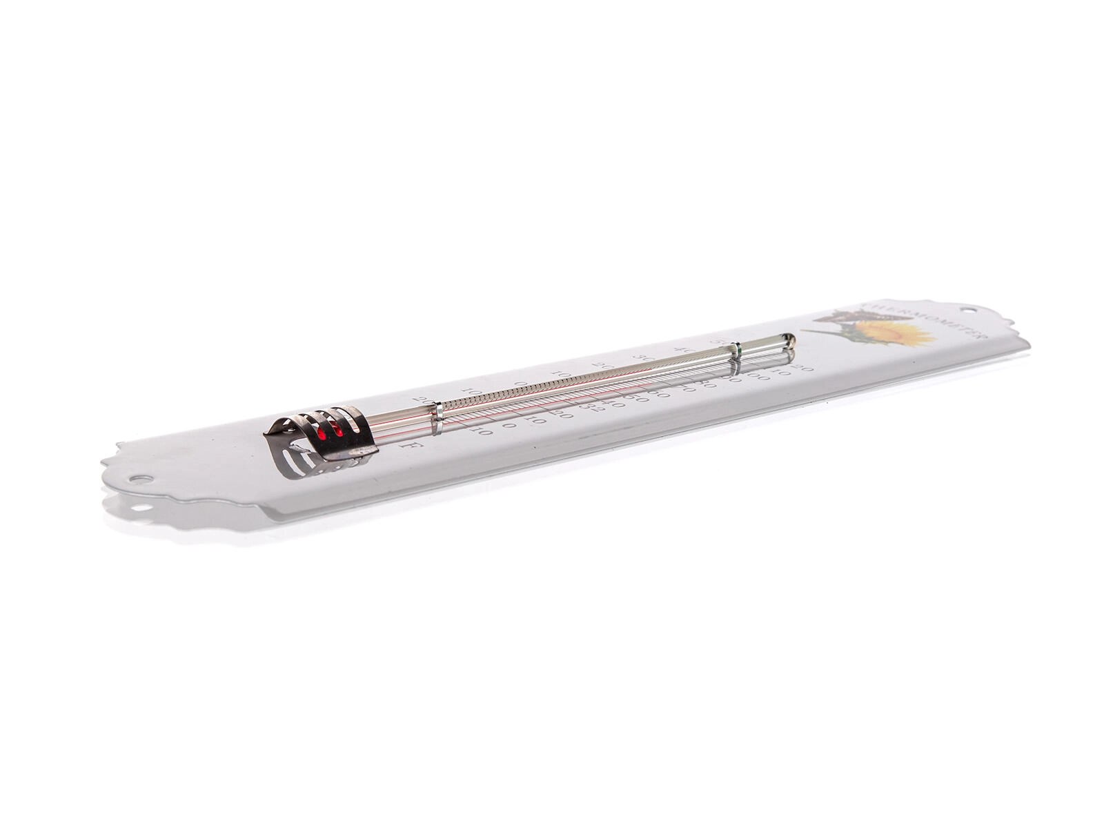 Teploměr je vybaven skleněnou kapilárou s červenou náplní pro jasné odečty, kontrastním potiskem a očkem pro zavěšení na stěnu. Hodí se do domácnosti, na balkon, terasu, do dílny či skleníku.