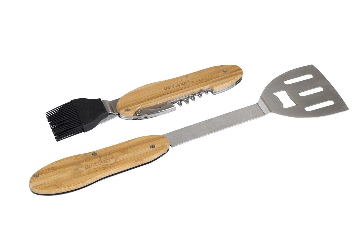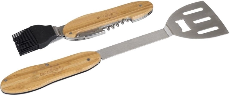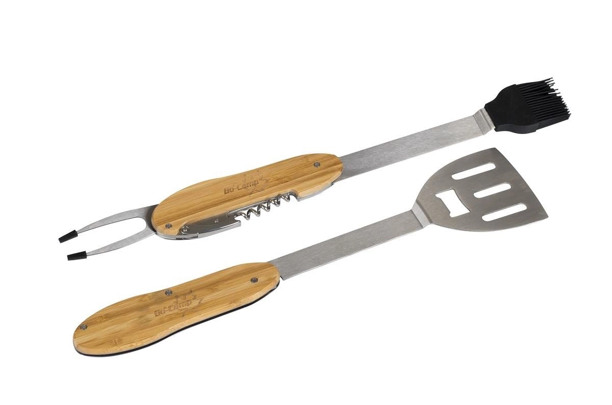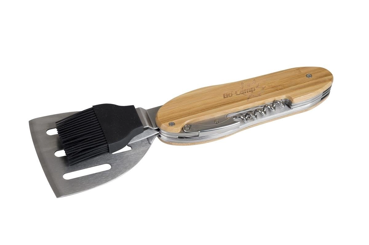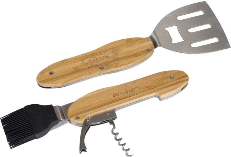 Praktické a odolné grilovací nářadí 5v1 kombinuje obracečku, vidličku, silikonový mašlovač, korkový šroub a otvírák lahví v jednom kompaktním setu. Ergonomické bambusové rukojeti a nerezová ocel zajistí pohodlné a dlouhotrvající používání u každého grilování.