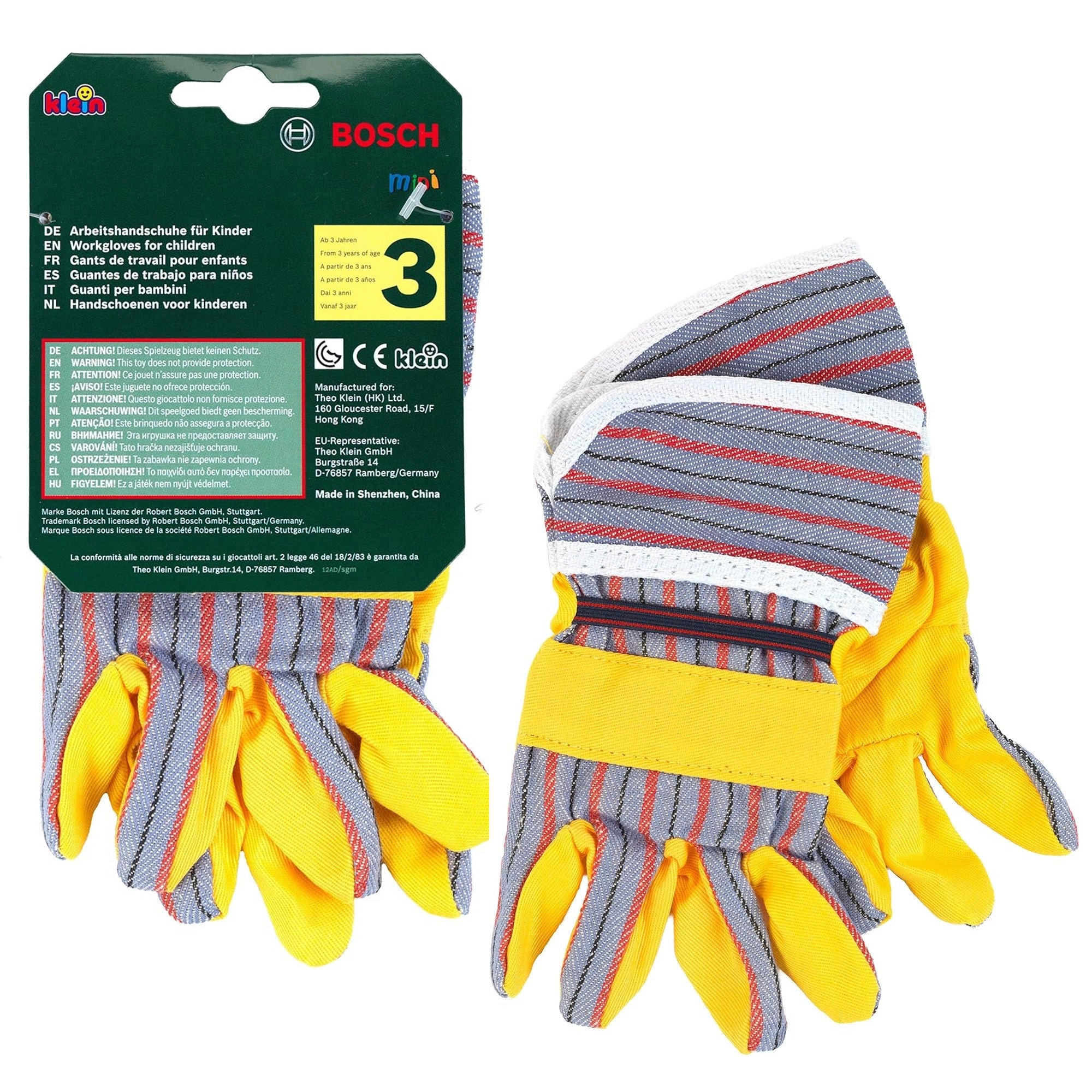 Dětské pracovní rukavice BOSCH od značky Klein jsou skvělým doplňkem pro malé kutily. Věrně napodobují skutečné rukavice, mají žluté dlaně s šedými pruhovanými prvky, elastické manžety pro lepší držení a jsou ideální pro hraní na řemeslníky a zahradníky.