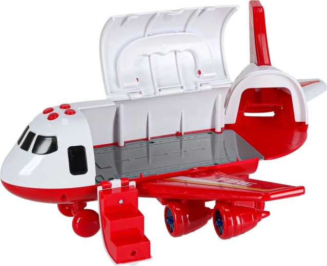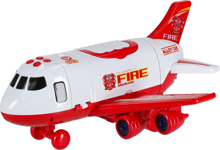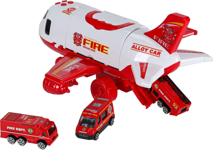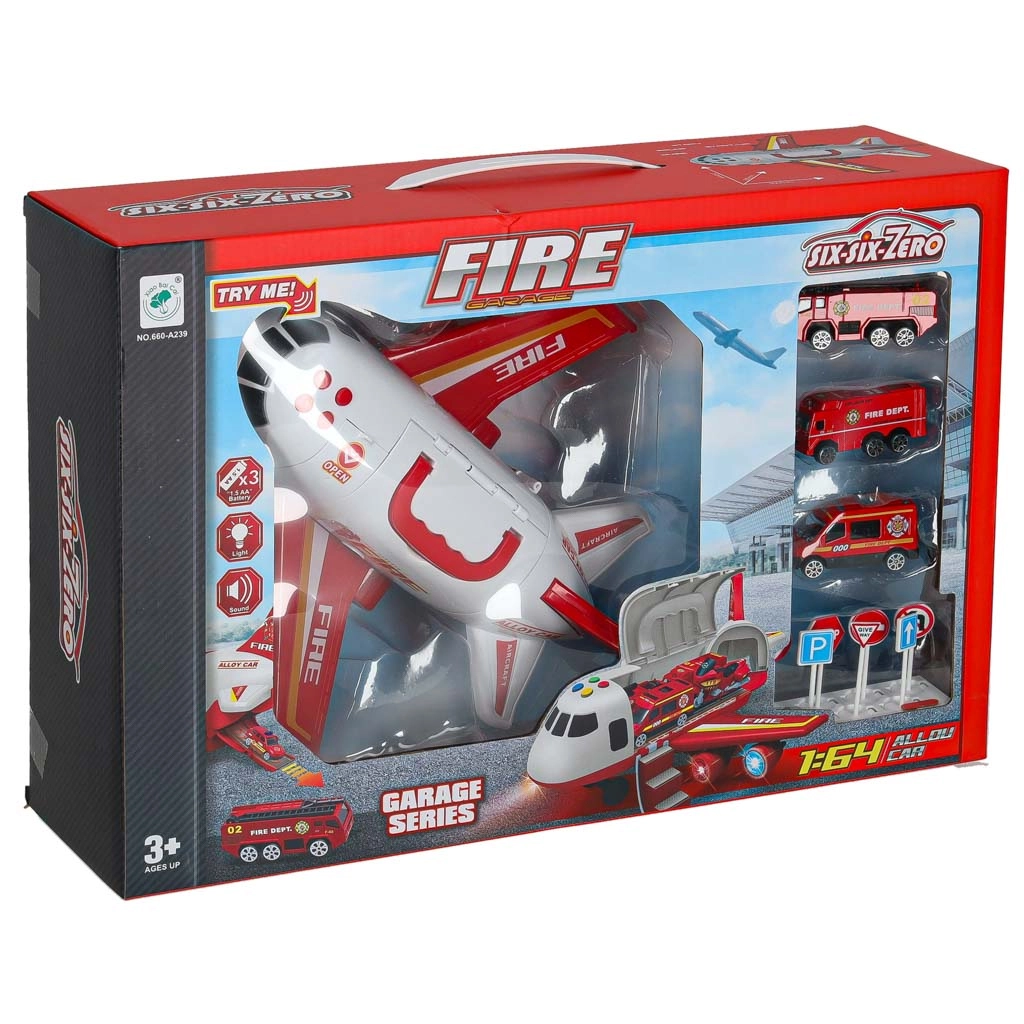 Součástí jsou 3 hasičská auta a sada 7 dopravních značek. Vše se vejde do útrob letadla, takže máte pořádek i připraveno na cesty.