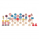 Sada 25 dřevěných dopravních značek a doplňků (např. kužely) pomáhá dětem pochopit pravidla silničního provozu v realistických herních scénářích. Díky čitelným symbolům a stabilním podstavcům se s nimi dobře manipuluje a jsou skvělým doplňkem k dopravním kobercům i vláčkodráhám.