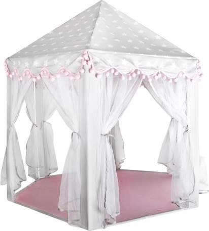 Vytvořte dětem bezpečný koutek pro odpočinek i fantazijní hry. Stan má kuželovou střechu, 6 otevřených vstupů se světelnými, prodyšnými záclonkami a stylový šedo‑růžový design s hvězdičkami, který zapadne do dětského pokoje i herního koutku. Díky lehké konstrukci na zacvaknutí ho sestavíte během chvilky a stejně snadno přenesete či uložíte.
