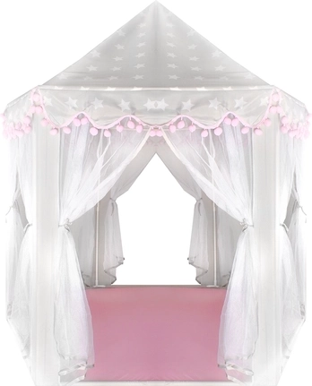 Prostorná podložka a vzdušné bočnice zajistí komfort pro jedno i více dětí – vejde se sem spousta polštářků, plyšáků i knížek. Stan se skvěle hodí do interiéru i na zahradu pod dohled dospělých. Dekorativní pompony a možnost zavázání záclonek na mašle dodají hře šmrnc i soukromí.