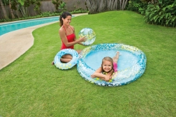 Sada obsahuje nafukovací bazén, plovací kruh a plážový míč – děti se mohou koupat, chytat míč i učit se jistotě ve vodě.