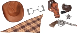 Klobouk, pouzdro na revolver, šátek, pouta, šerifská hvězda, revolver