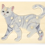 Úkolem dítěte je složit obrázek kočky nejen podle ilustrace, ale i podle tvaru jednotlivých dílků. Knoflíkové úchytky usnadňují uchopení malými prsty a podporují správné vedení ruky. Pevná dřevěná deska drží dílky jistě na místě a odolá každodennímu používání.