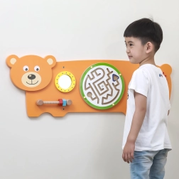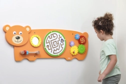 Smyslová tabule Medvídek je navržena podle principů Montessori tak, aby děti přirozeně motivovala k objevování a procvičování dovedností. Nabízí více druhů aktivit: otáčení ozubených kol, vedení kuličky v labyrintu, pozorování v bezpečném zrcátku a trénink úchopu pomocí šroubků na závitu. Díky robustní dřevěné konstrukci a možnosti nástěnné instalace se skvěle hodí do dětských pokojíčků, heren i mateřských škol.
