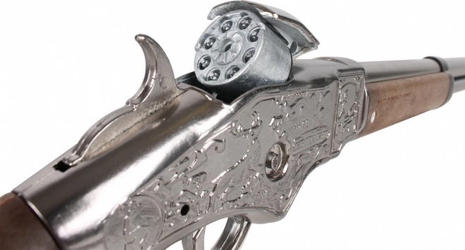 Objevte svět divokého západu s touto kovbojskou puškou, která nabízí autentičnost a bezpečnou zábavu pro děti díky své kovové konstrukci a kapacitě 8 ran.