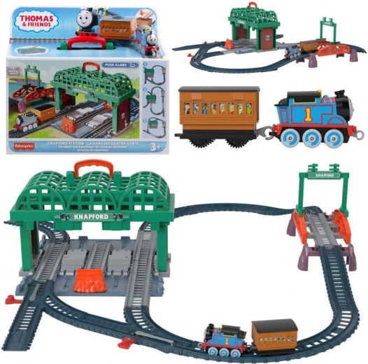 Stanice Knapford s úložným panelem a madlem, díly kolejí, most, nadjezdové značení, mašinka Tomáš (push‑along), osobní vagónek s cestujícími