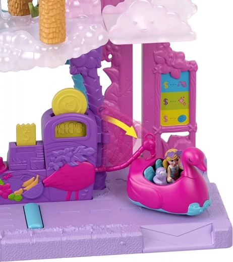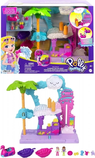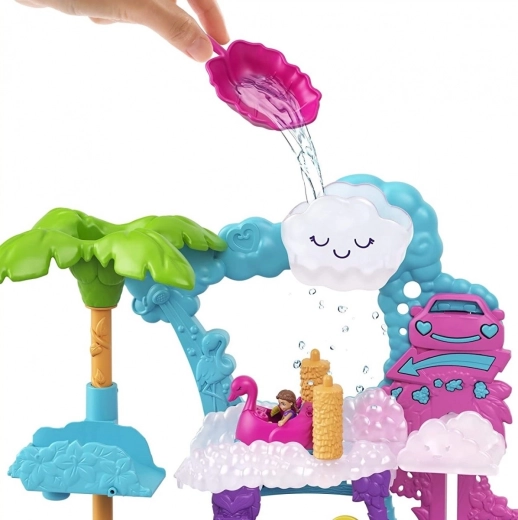 Na „zpomaleném prahu“ se odhalí prvky benzínové stanice s hadicí ve tvaru plameňáka – připravit, natankovat a hurá zpět do akce! V autě se sveze panenka i zvířecí kamarád (tukan nebo lenochod). Set je kompatibilní s většinou vozidel POLLY POCKET a nabízí hodiny fantazijní hry s vodními prvky.