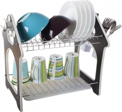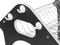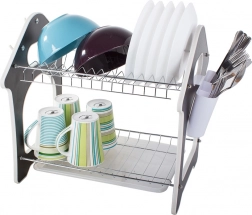 Tento dvouúrovňový sušák na nádobí efektivně využívá vertikální prostor a pojme až 14 talířů na horní polici, zatímco spodní police je ideální pro misky, hrnky a sklenice. Součástí je odnímatelný držák na příbory, který lze umístit na libovolnou stranu, a tři háčky pro zavěšení kuchyňských nástrojů.