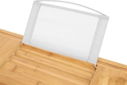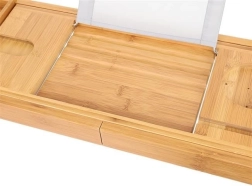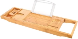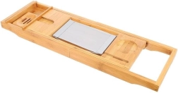 Skab spa-stemning derhjemme. Den udtrækkelige bambusbakke hviler sikkert på karkanterne og holder alt nødvendigt inden for rækkevidde – fra telefon og bog til drikkevarer og kosmetik. Takket være justerbar længde på 75–112 cm passer den til de fleste badekar.