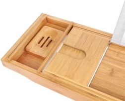Den praktiske inddeling byder på holder til tablet/bog med metalstøtte og 3 positioner, en dedikeret åbning til vinglas, aftagelig sæbeskål samt indsats til håndklæde, plus en niche til lys eller duft. Bambustræ er naturligt modstandsdygtigt over for fugt, let at vedligeholde og ser elegant ud på badeværelset.
