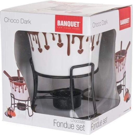 6-delt sæt til chokoladefondue CHOCO DARK: 1x keramikskål – diameter 11,5 cm, højde 7,5 cm, 1x stativ med holder til fyrfadslys – højde 8 cm, 4x fonduegafler – længde 15 cm, materiale rustfrit stål + PP.
