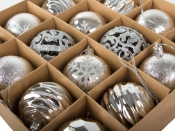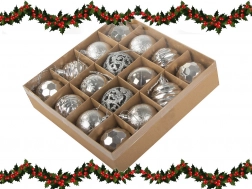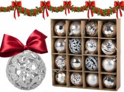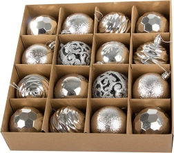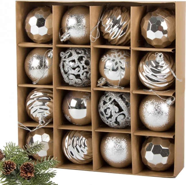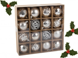 Pynt dit juletræ med disse elegante sølvfarvede ornamenter, som bringer festlig glans ind i hjemmet. Sættet indeholder 16 dele i fem forskellige designs, hvor hver tilføjer sin egen unikke charme.