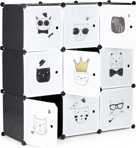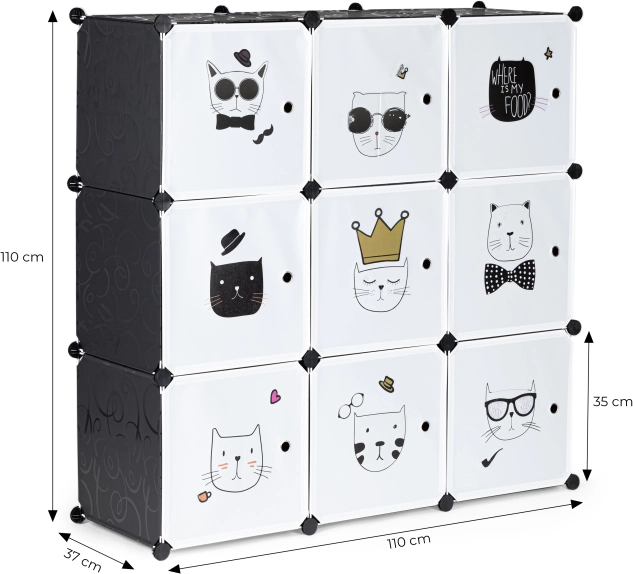 Låger med legende kattemotiver giver liv til børneværelset og motiverer børn til selv at holde orden. Monteringen er meget enkel takket være stærke ABS-forbindelser – skabet samles på ingen tid og kan altid ombygges.