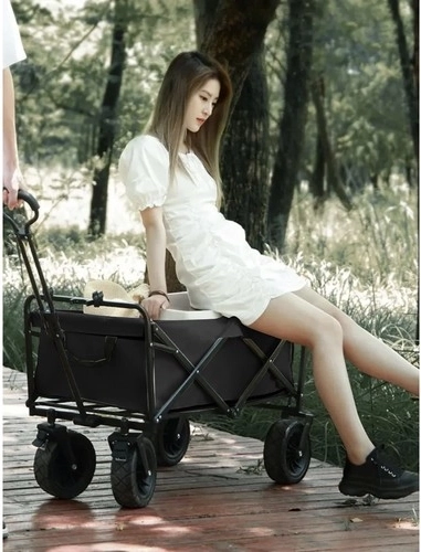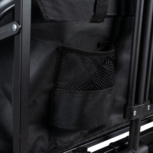 Forstærket bund og vandafvisende Oxford 600D-stof tåler krævende brug. To frontlommer rummer drikkevarer og småting, og efter sammenklapning er vognen let at bære.