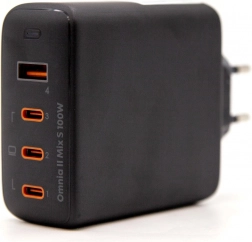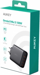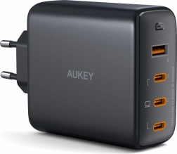 Aukey Omnia II er en kraftfuld 100W oplader med GaN-teknologi, der understøtter Power Delivery 3.0 og Quick Charge. Takket være fire USB-porte (3x USB-C og 1x USB-A) kan den oplade op til fire enheder samtidigt.