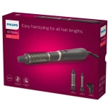 Samtidig tørring og styling med Philips Air Styler Essential gør det muligt at skabe smukke, naturlige frisurer og giver pleje til håret. Tre tilbehør passer til både langt og kort hår, så stylingen er meget nem.
