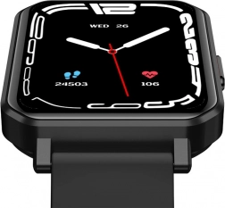 Rektangulær skærm med moderne urskiver viser tid, dato, skridt og puls tydeligt ved første blik – ideel til både arbejde og træning.