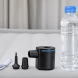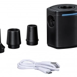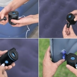 Takket være flow på 90 l/min klarer pumpen hurtig oppumpning og tømning. Betjeningen er intuitiv – der skal blot én knap til. Med tre mundstykker passer den til de fleste almindelige ventiler på oppustelige madrasser, baderinge, liggestole og campingunderlag.