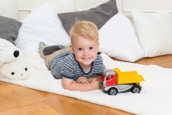 Opfylder alle EU's sikkerhedsstandarder, hvilket sikrer barnets sikkerhed under leg. Denne farverige lastbil vil understøtte udviklingen af dit barns fantasi og fine motoriske færdigheder.