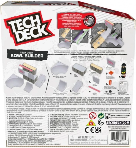 Saml forskellige kombinationer af din egen skatepark med ramper, gelændere og forskellige forhindringer. Lær nye tricks med det eksklusive fingerboard. Pakken indeholder 1 Tech Deck fingerboard, 1 bowl-rampe, 1 lille rampe, 1 rampe, 1 lille boks, 1 boks, 1 panel, 1 Tech Deck-panel, 1 coping, 9 X-forbindelser, 5 store X-forbindelser, 9 fødder, vejledning. Velegnet fra 6 år.