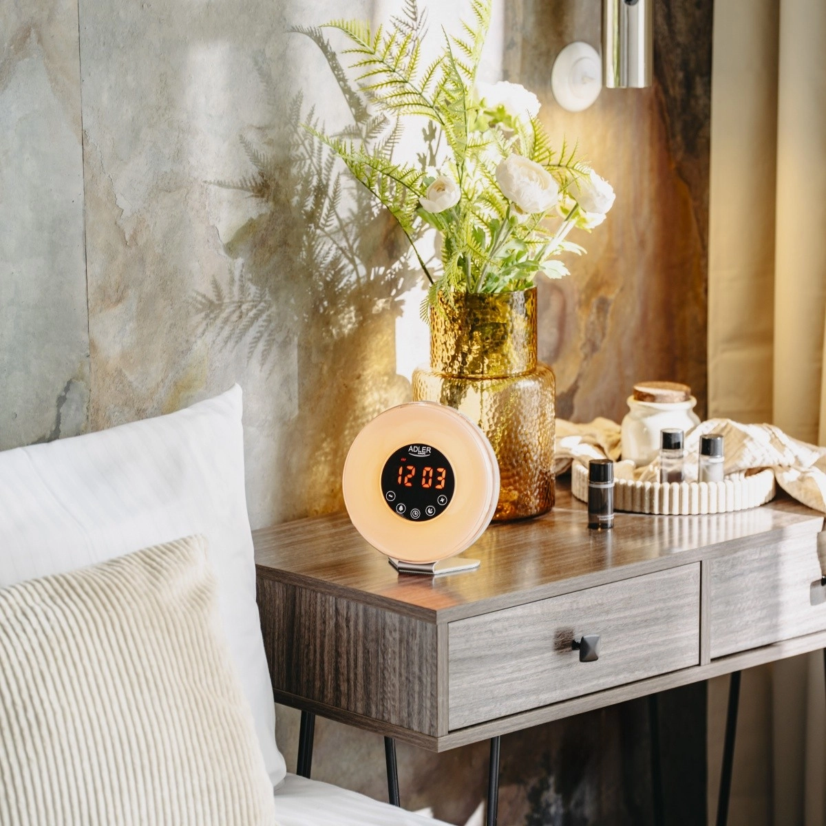 Vækkeuret øger gradvist lyset for at vække dig blidt og uden stress. Understøtter en sund søvnrytme og mere behagelige morgener.
