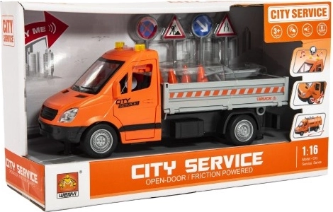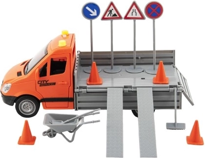 Hold byen i orden med en detaljeret vejvedligeholdelsesbil. Takket være friktionsmotoren kører køretøjet, når det skubbes, lys- og lydeffekter forstærker stemningen af ægte vejarbejde, og de medfølgende skilte, kegler og hjælpemidler udvider lege-scenarierne.
