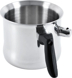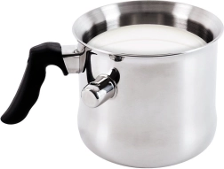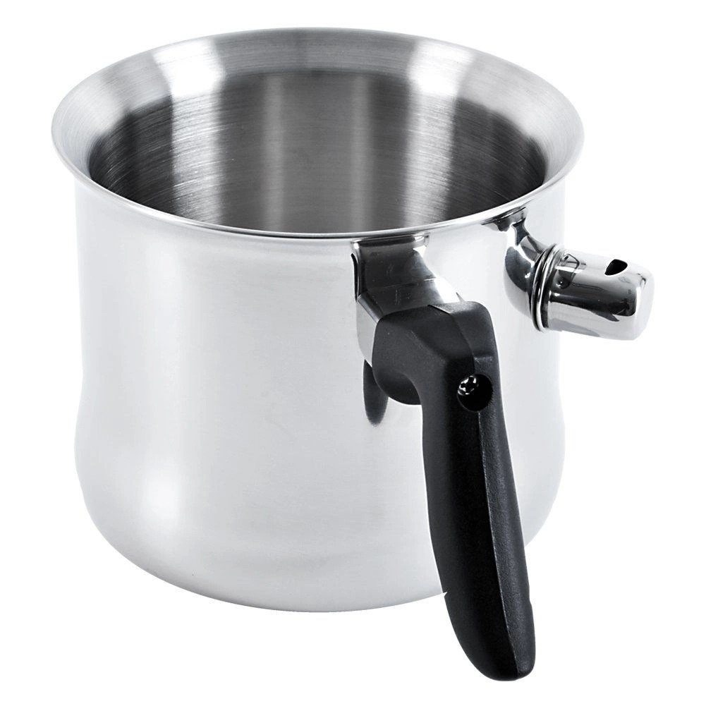 Denne mælkekande med dobbeltvæg og vandkappe er et fremragende valg til skånsom opvarmning af mælk, chokolade, budding eller fine saucer. Skru blot fløjteventilen af, hæld vand i kappen og kog – når mælken er klar, giver ventilen lyd. Det ergonomiske sorte håndtag ligger godt i hånden og sikrer sikker håndtering.