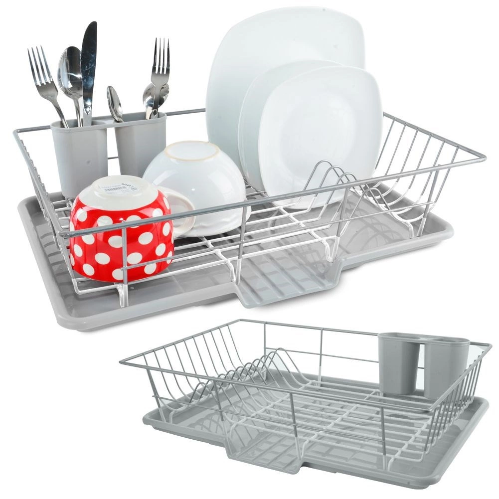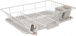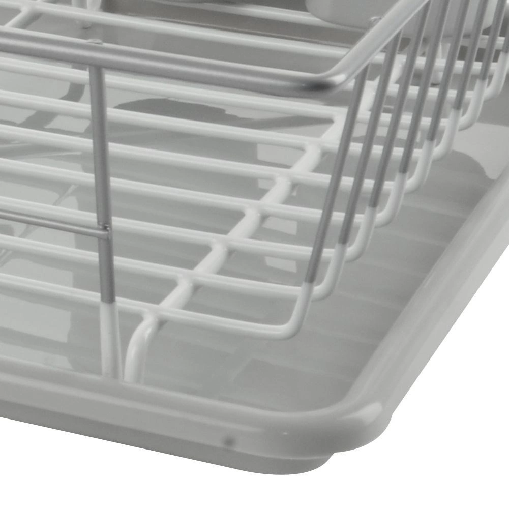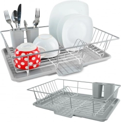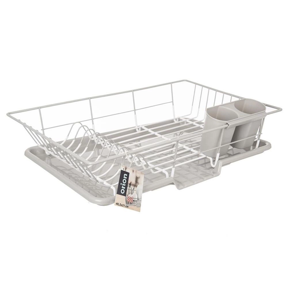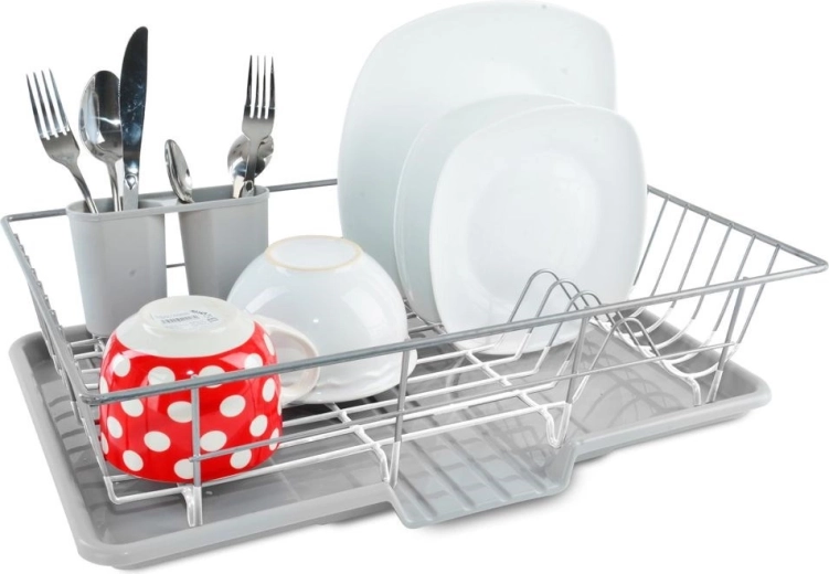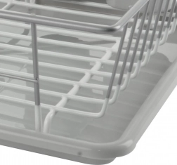 Elegant og praktisk opvaskestativ i størrelsen 46,5 × 31 × 13 cm gør det nemt at tørre tallerkener, skåle, glas og bestik uden at vand samler sig på køkkenbordet. Den metalramme i rustfrit stål med gråhvid beskyttende overflade er stabil, korrosionsbestandig og let at rengøre.