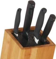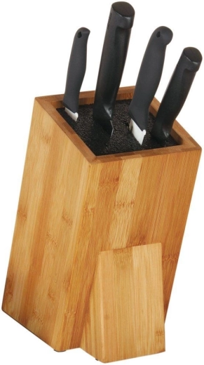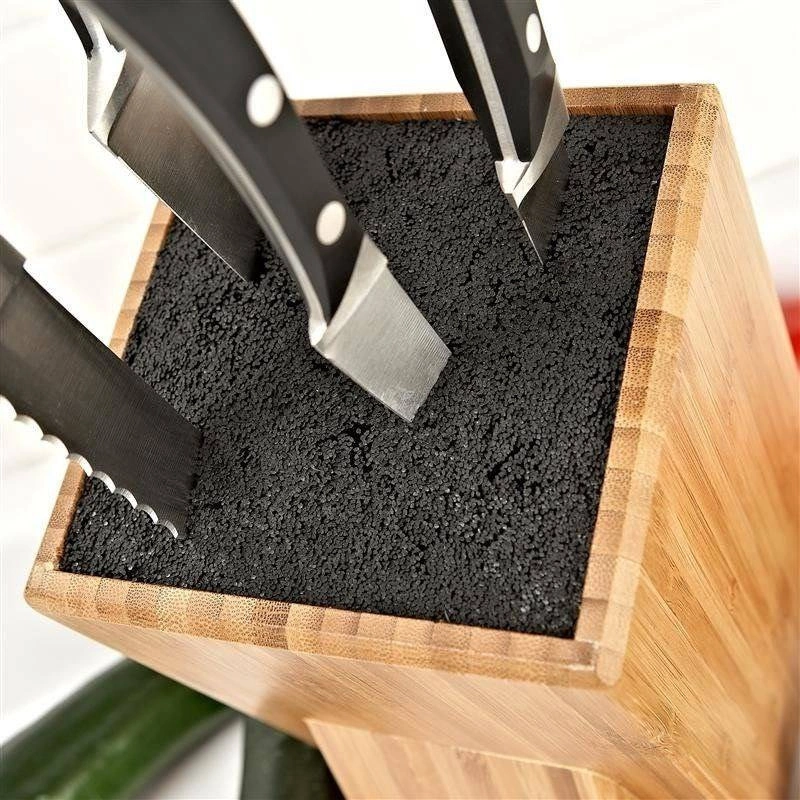 Elegant bambus-knivblok i størrelsen 17 × 11,5 × 24,5 cm tilbyder universel og sikker opbevaring af alle typer køkkenknive – stål, keramiske og kombinerede. Takket være de aftagelige plastfibre tilpasser den sig forskellige klingeformer uden at sløve dem, har skridsikre puder for stabilitet og et moderne design, der passer smukt ind i ethvert køkken.