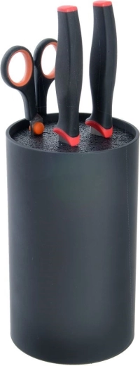 Stilfuld universel knivblok med mål 11 × 11 × 18 cm, der sikrer sikker og overskuelig opbevaring af køkkenknive, sakse og redskaber. Har en udtagelig børsteindsats, som tilpasser sig forskellige klingeformer uden risiko for at sløve dem. Let og holdbar plast i elegant sort farve passer til både moderne og klassiske køkkener. ORION kvalitet efter europæiske standarder.