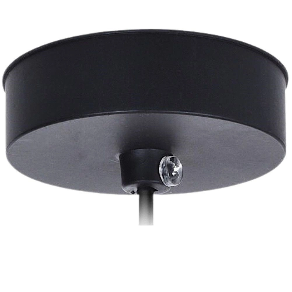 Den runde loftroset i mat sort dækker elegant for ledninger og fastgørelse.