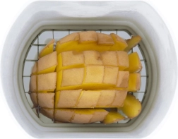Brugen er enkel: læg kartoflen i, tryk, og så er det gjort. Skæreren klarer også squash, æbler eller pærer – ideel til salater, ovnretter og grøntsagstilbehør. De kompakte mål sparer plads i køkkenet og gør opbevaringen lettere.