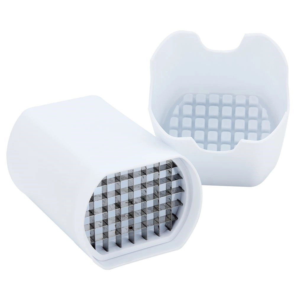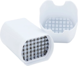 Lav sprøde hjemmelavede fritter på få sekunder. Den manuelle skærer med gitter i rustfrit stål skærer kartofler og andre råvarer præcist og hurtigt i ensartede stave eller tern. Det holdbare hvide korpus af kvalitetsplast giver stabilitet og lang levetid, mens de skarpe blade i rustfrit stål sikrer et rent snit uden at rive.
