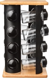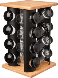 Hold styr på dine krydderier og hav alt lige ved hånden. Det drejelige stativ med træplade øverst og nederst samt sort metalkonstruktion rummer 16 krydderiglas. Hvert glas har et sort skruelåg og en hvid indsats for komfortabel og jævn dosering. Det gennemsigtige glas gør det let hurtigt at tjekke indhold og mængde.