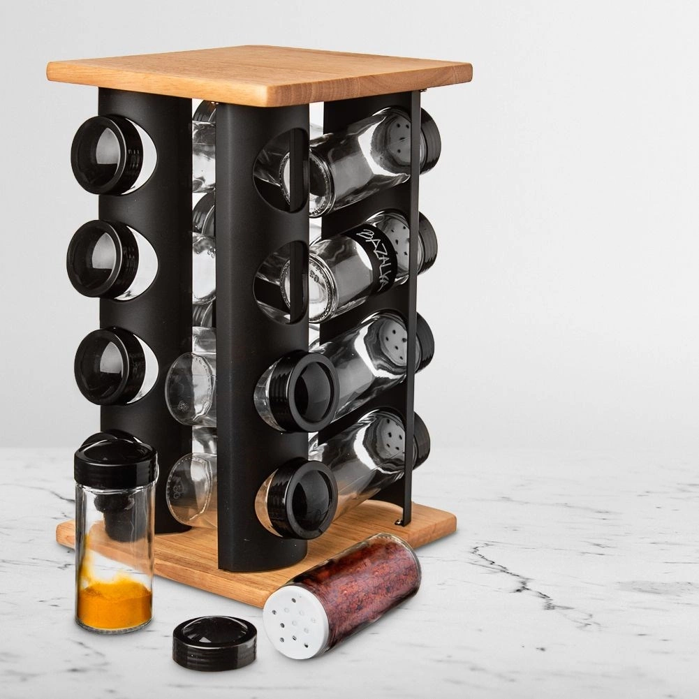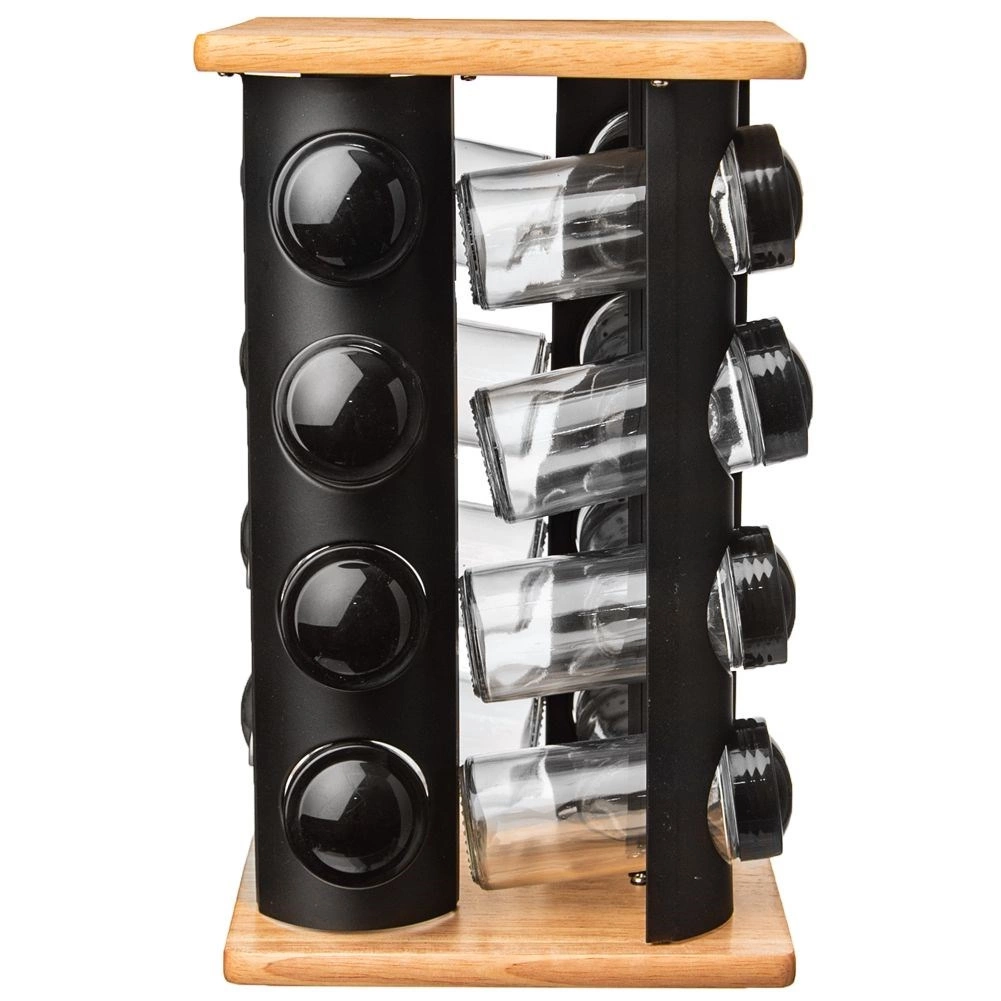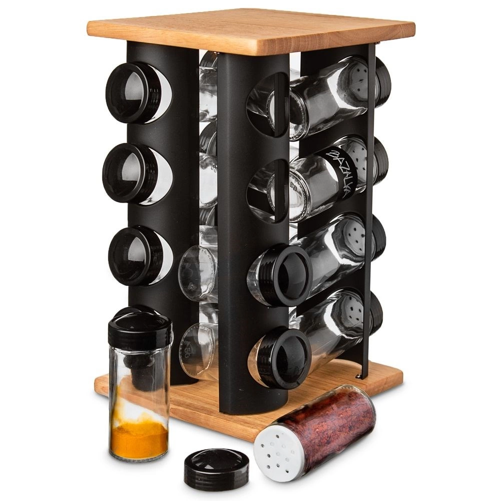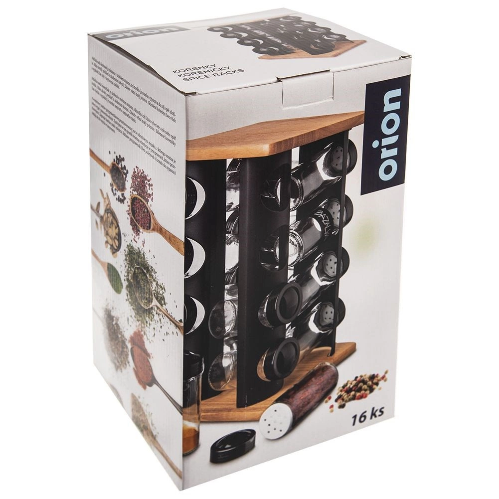 Elegant drejeligt krydderistativ med 16 krydderiglas i glas holder dit køkken overskueligt og stilfuldt. Kombinationen af sort metal og træ er solid og holdbar, glassene på 80 ml har skruelåg og indsatse for nem dosering. Takket være den roterende konstruktion finder du hurtigt det ønskede krydderi, og de gennemsigtige glasvægge giver øjeblikkelig kontrol over indholdet. Glaselementer kan vaskes i opvaskemaskinen. Mærke ORION.