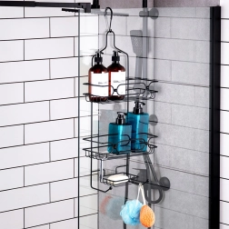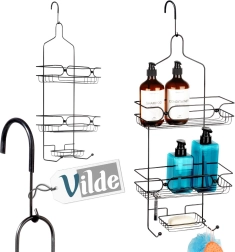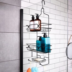 Den praktiske hængende brusehylde i elegant sort holder dit badeværelse overskueligt og stilfuldt. Den tilbyder montering uden boring, holdbar metalkonstruktion med antikorrosionsbehandling og en krog belagt med gummi for sikker ophængning uden at ridse glasset. To rummelige hylder, en sæbeskål og kroge til tilbehør holder alt lige ved hånden.