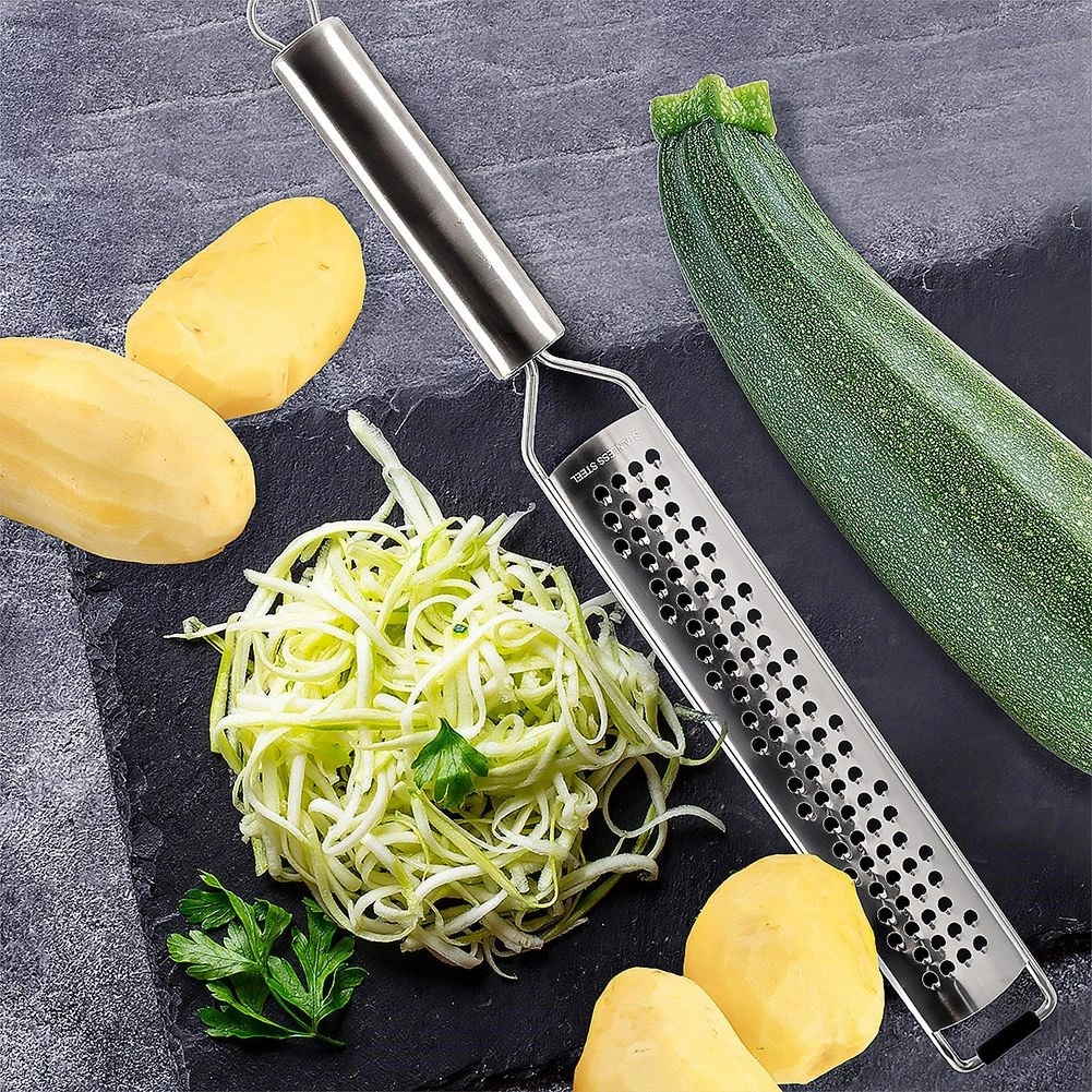 Praktisk fladt rivejern i rustfrit stål med en længde på 38 cm og en bredde på 4 cm til hurtig og jævn rivning. Takket være de skarpe huller kan du nemt rive grøntsager, hårde oste, hvidløg, nødder og citrusskal. Det har et langt håndtag med øje til ophæng, en skridsikker endekappe for sikker brug på køkkengrej og et beskyttelsesetui til sikker opbevaring. Tåler opvaskemaskine.
