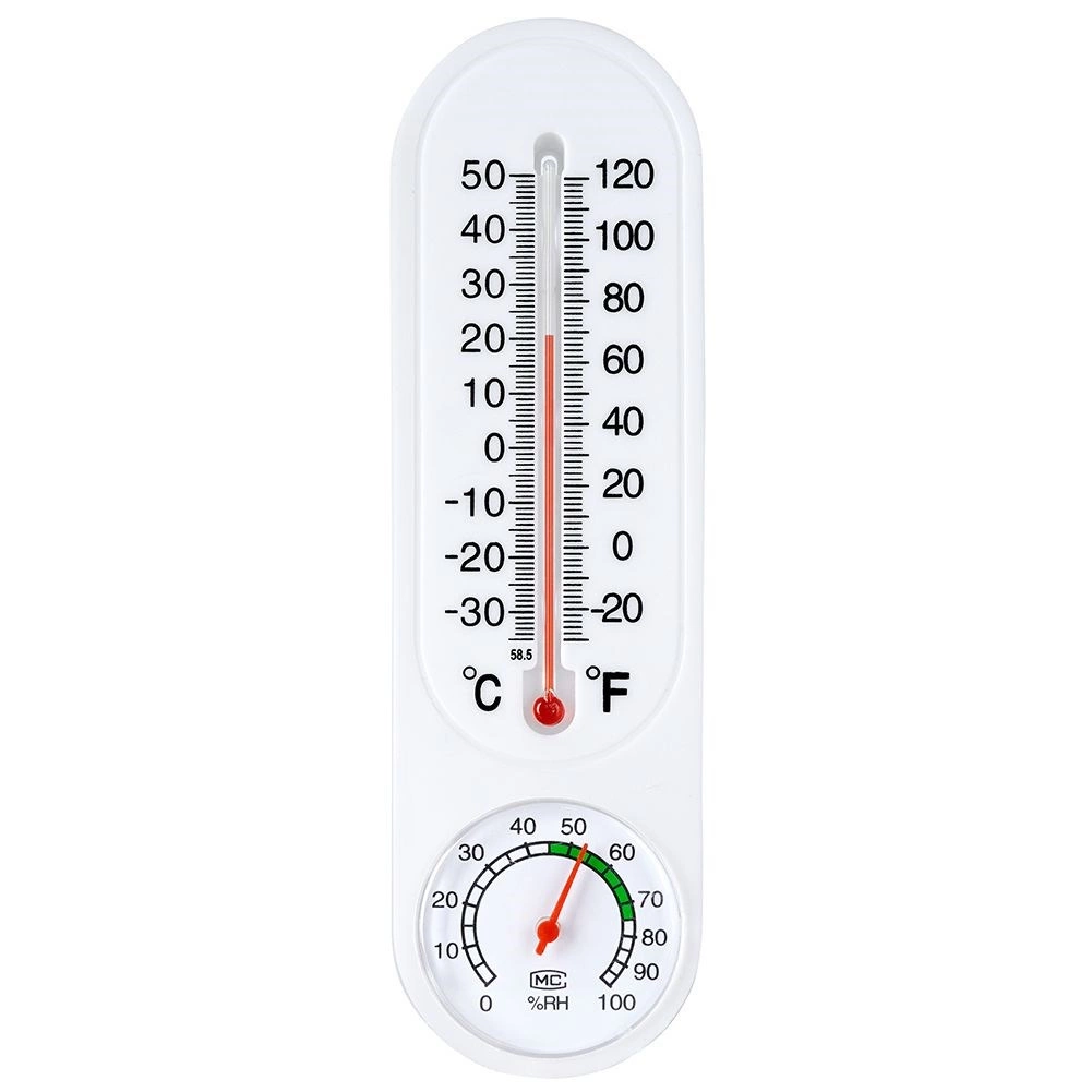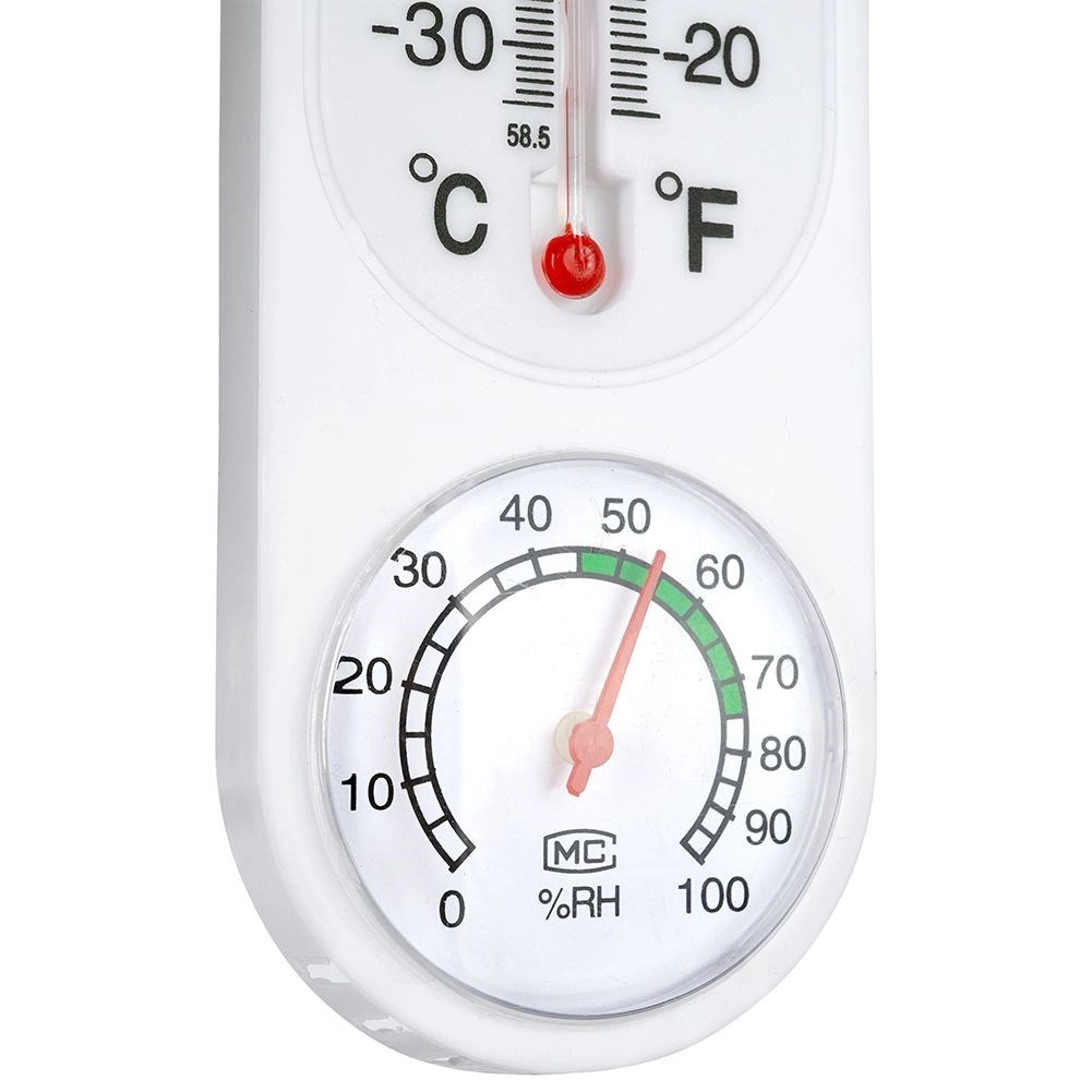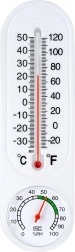 Dette kombinerede termometer og hygrometer giver dig overblik over omgivelsestemperaturen og relativ luftfugtighed i realtid. Den vertikale væskesøjle viser temperatur i °C og °F, mens den nederste runde skive viser fugt i intervallet 0–100 % RH med komfortzone for hurtig orientering.