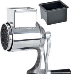 Opdag en pålidelig køkkenhjælp: en hånddrevet rustfri rive med fastspænding. Den kombinerer kvalitets rustfrit stål og holdbare plastdele i sort for lang levetid og behagelig daglig brug. Med traditionel mekanisk løsning og et komfortabelt håndsving laver du nemt frisk rasp eller fintrevne nødder, chokolade eller ost.