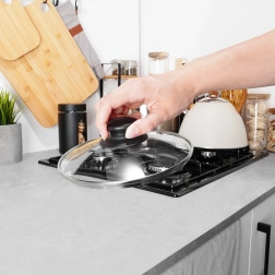 Takket være det gennemsigtige glas kan du nemt overvåge tilberedningen og minimere varmetab. Den integrerede udluftningsåbning leder effektivt overskydende damp væk, hvilket forhindrer overkogning og tilsmudsning af kogepladen. Den høje kant sikrer tæt tilslutning til grydens kant og reducerer sprøjt.